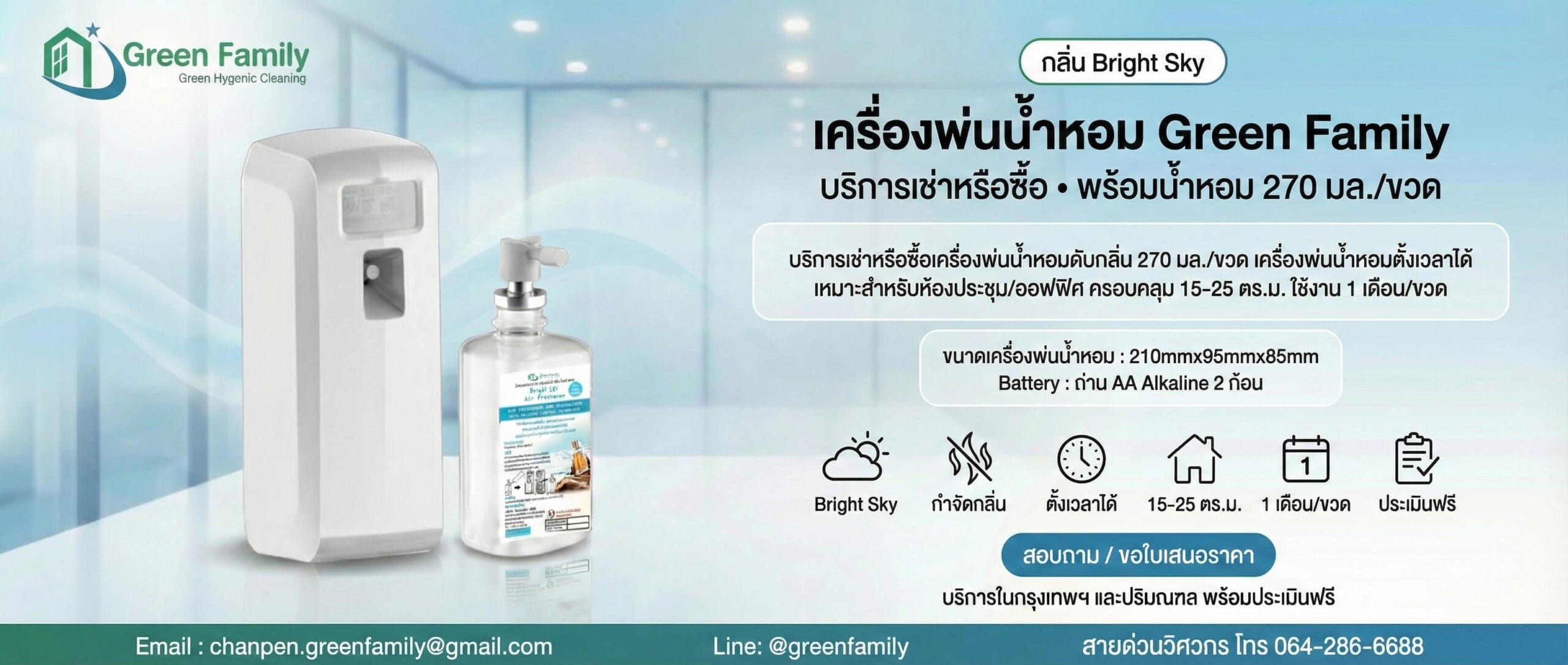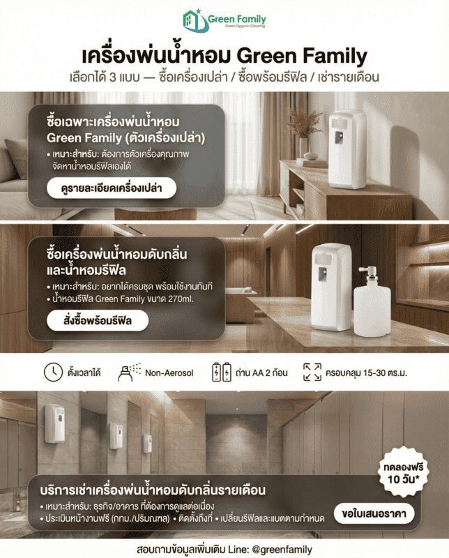 #เครื่องพ่นน้ำหอม #เครื่องพ่นน้ำหอมอัตโนมัติ #เครื่องพ่นน้ำหอมตั้งเวลา #GreenFamily #NonAerosolAirFreshener #เครื่องกระจายกลิ่น #เครื่องทำความหอม #น้ำหอมปรับอากาศ #ขายเครื่องพ่นน้ำหอม #จำหน่ายเครื่องพ่นน้ำหอม