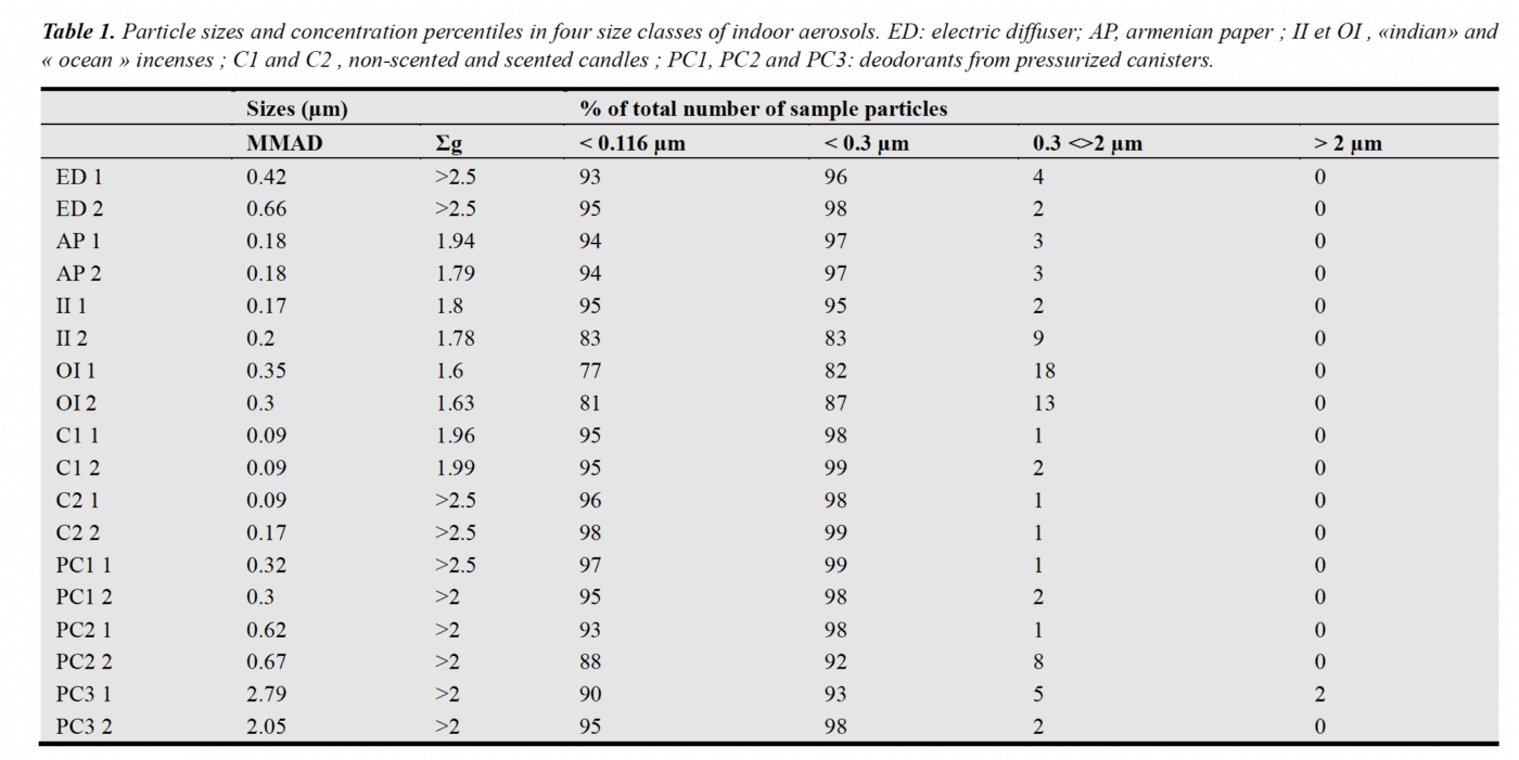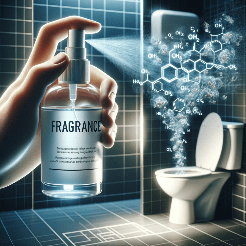 4. น้ำหอมที่ใช้ในการดับกลิ่นห้องน้ำแบบสเปรย์ปรับอากาศ (Aerosol Air Refresher) มีผลจากการวิจัยที่พบว่า เมื่อนำสเปรย์ปรับอากาศมาตรวจขนาดอนุภาค (particle) ของละอองสเปรย์ โดยใช้เครื่องมือ ELPI (Electronical Low Pressure Impactor) พบว่า 82-99% ของสินค้าจำนวน 9 ตัวอย่างจากท้องตลาด (เช่น สเปรย์ปรับอากาศ, Aroma Diffusers , Plugged diffuser) มีขนาดอนุภาคเล็กกว่า 0.3 µm ซึ่งอนุภาคเหล่านี้สามารถทะลุผ่านไปยังหลอดลม (bronchi) และถุงลม (alveoli) ที่เล็กที่สุดได้ ซึ่งบ่งบอกถึงความเป็นไปได้ที่อนุภาคสารเคมีในละอองสเปรย์จะสะสมในปอดและแพร่กระจายเข้าสู่กระแสเลือด